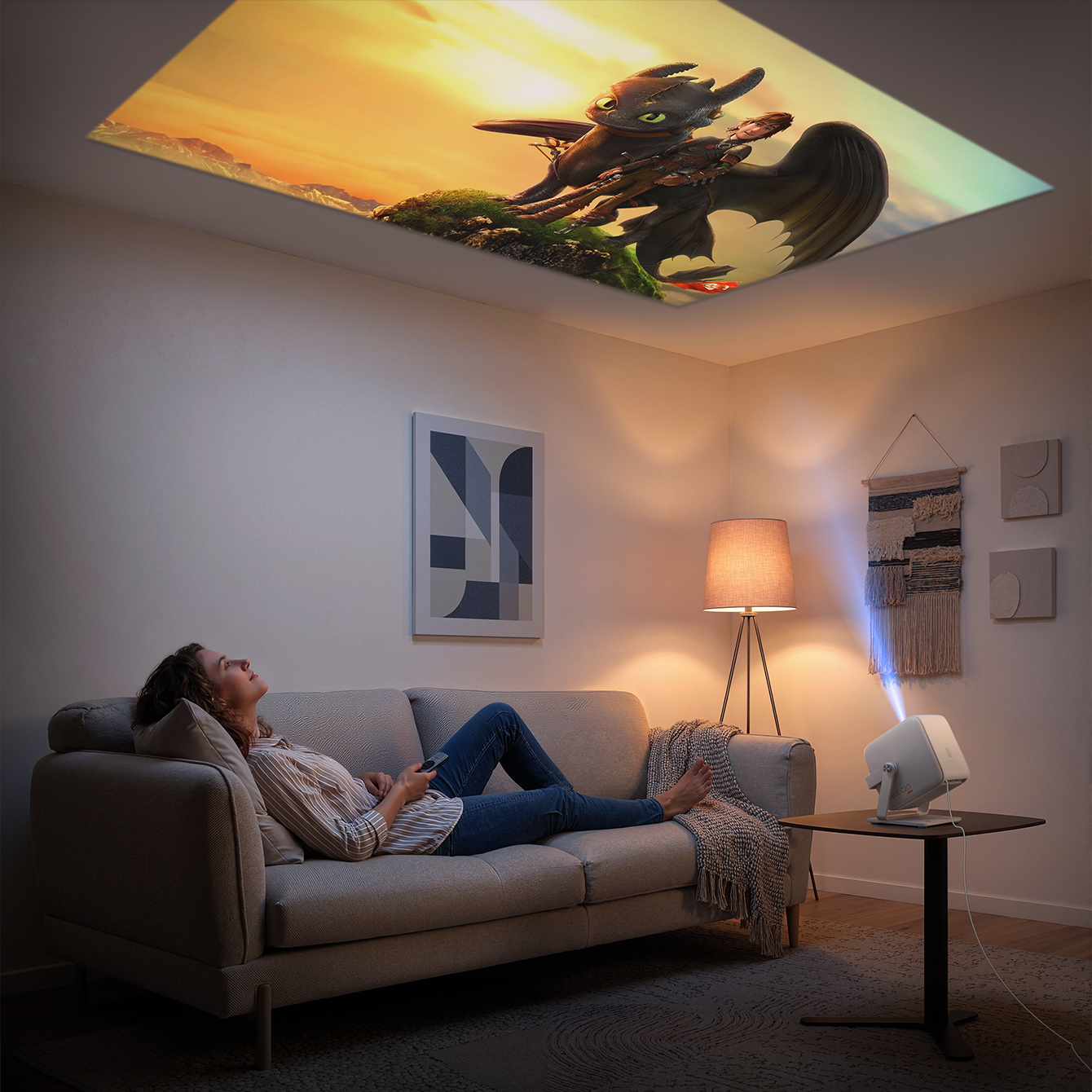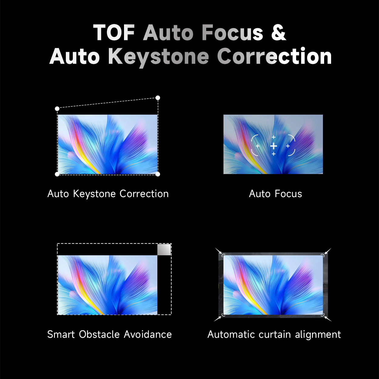 180° Flexible Projection, Effortless Setup Enjoy ultimate flexibility with 180° adjustable projection, allowing you to project on walls, ceilings, or any angle you like. Combined with auto focus and auto keystone correction, OBE instantly delivers a perfectly aligned, sharp image—no manual setup needed.