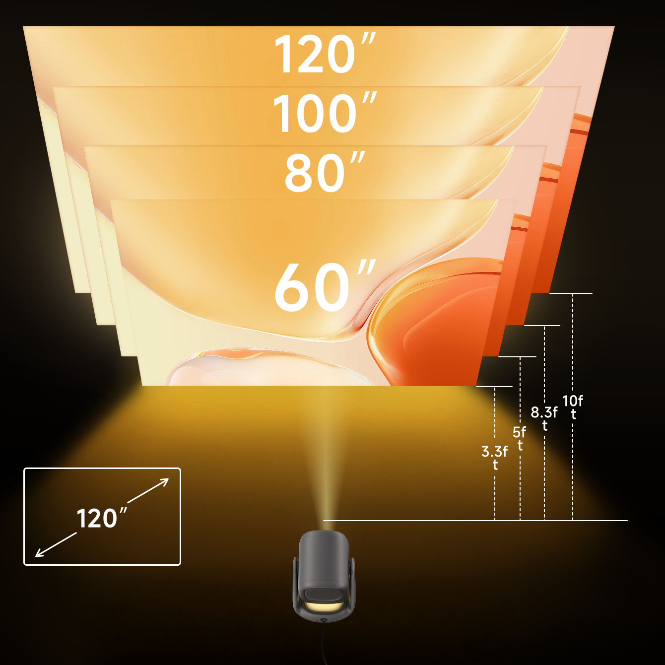 Flexible Screen Size from 40” to 120” Adjust your screen size from 40 to 120 inches to fit any space. Whether it’s a small bedroom setup or a large living room experience, enjoy the perfect screen size for every moment.
